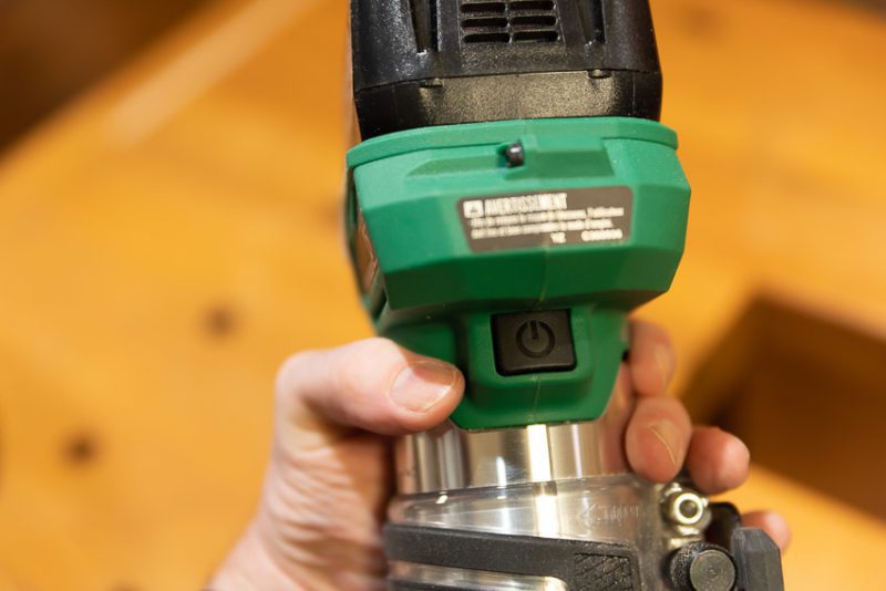 Turning on and off the Metabo HPT M1808DAQ4 can sometimes be a little frustrating. It has a bubble-style button on one side of the tool and a physical button on the other. The bubble-style button unlocks the router, then you have 10 seconds to start the tool by pressing the physical button. Most of the time this works fine unless you are like me and keep switching the direction of the buttons sometimes when you change the bit.
