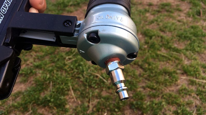 The lack of a swivel intake wasย noticeable as I worked around some of the lighter trim work for the day. The ergonomics of the nailer on its own are excellent, but fighting the hose stiffness throws it off.