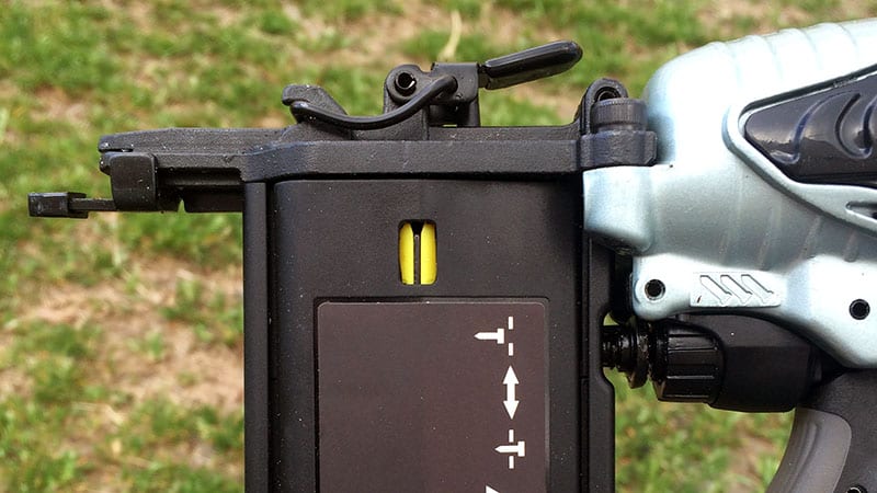 The side-loading magazine holds 100 nails from 5/8โ€ณ to 2โ€ณ in length. Thereโ€™s a yellow indicator in the composite magazine window to let you know when youโ€™re getting low on nails with just a quick glance. This is nice, but itโ€™s also in place of a dry fire lockout. Given the choice between the two, Iโ€™d rather have the lockout to prevent damage.