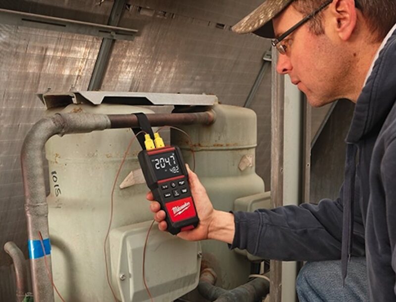 The new Milwaukee 2270-20 Contact Temperature Meter can simultaneously measure two temperature points. It has a high contrast white-on-black display that can be read across the room, and simple controls are easy to use. In fact, the entire user interface is straightforward. The tool performs Celsius to Fahrenheit conversion, simultaneous T1 and T2 measurements, and even difference measurements. It can store minimum and maximum temperature readings and has a strong, removable magnetic base for hanging it directly, or via suspension, off ductwork, panels, and other metallic surfaces.