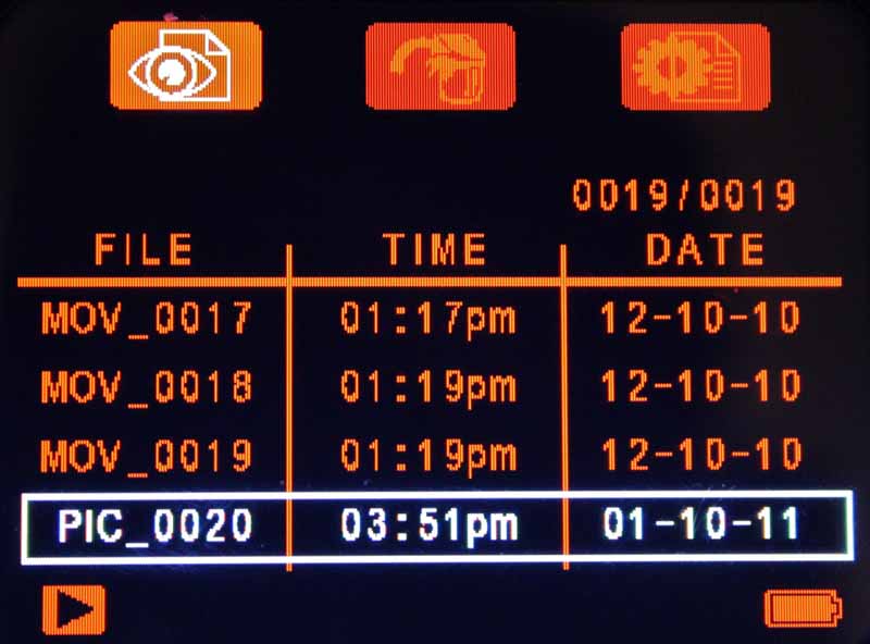 In Playback mode, you are greeted with a listing of stored video and still image files. Each file is labeled with the time and date in addition to the generic name given to it (MOV_xxxx or PIC_xxxx). Here you can view/replay files, delete files, and also access the M-Spector settings (these modes are activated by clicking the left and right navigation buttons). All files get stored to the included 2GB SD card which is protected, along with the USB connector, by a rubberized cover n the left side of the LCD screen. Capturing stills and video, or initiating playback or deletion, is always accomplished by the center button, so that makes it very easy and intuitive to accomplish anything you want to do with the M-Spector AV.