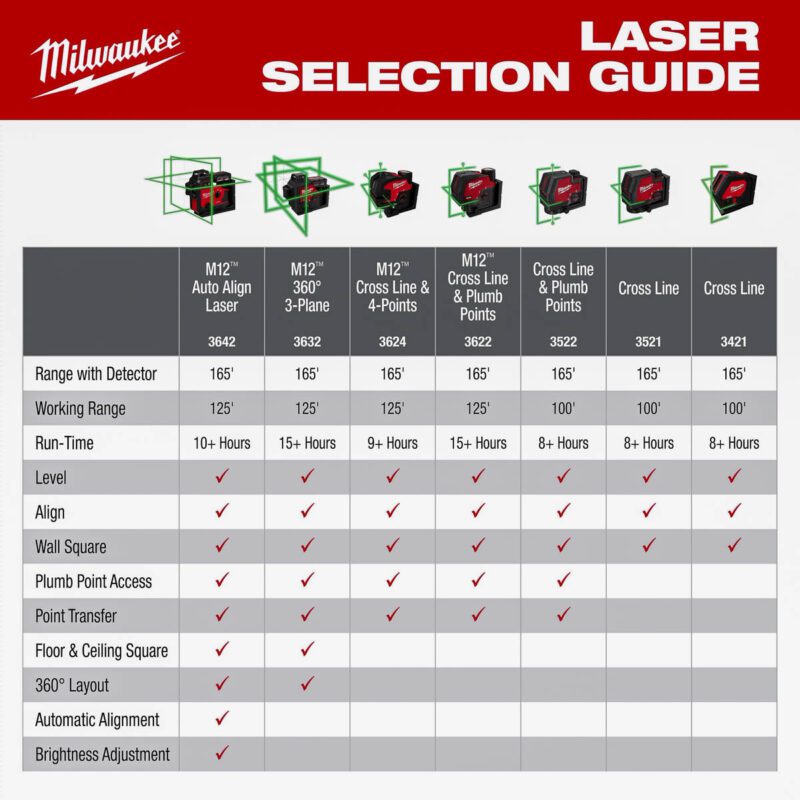 Milwaukee has several laser-level models on the M12 platform, so choosing the right one can be a little difficult. Luckily, they have a chart that lays out the key characteristics so you can determine which one is right for you!