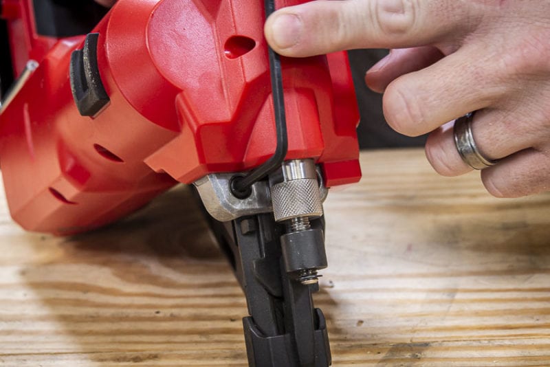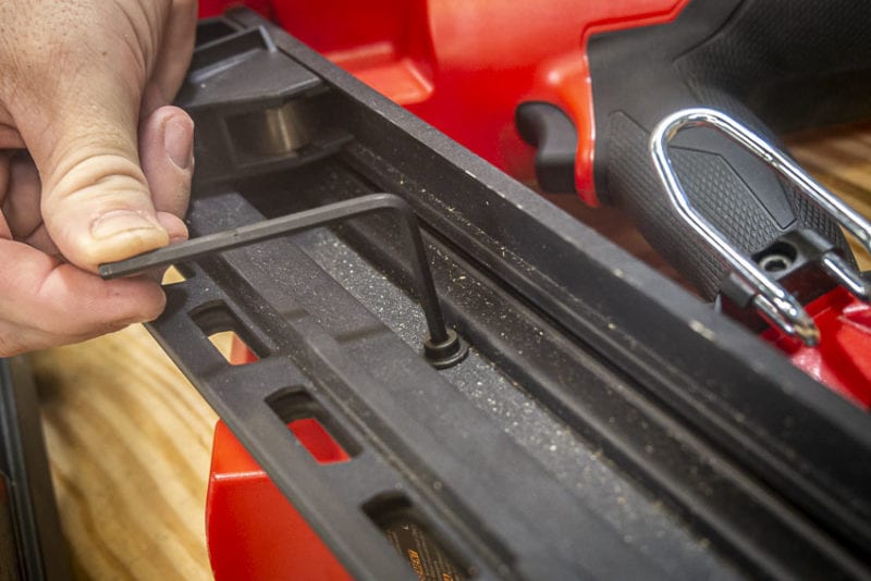 If you get a jam, thereโ€™s enough access to get a pair of needle-nose pliers around the offending nail. If you still canโ€™t quite get it, the Allen wrench stores conveniently along the right side of the nailer to remove the magazine.