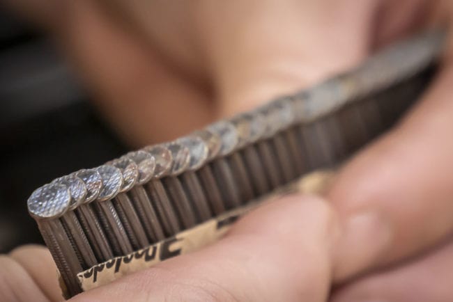 With code-approved pattern and fasteners, we need to lay down our plywood with 2 3/8-inch ring shank nails. Initially, the nails were a little proud, but a quick depth adjustment took care of that.