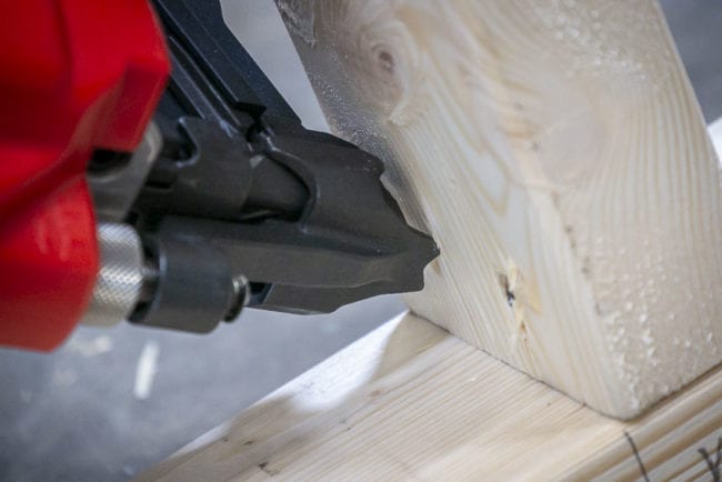 The Milwaukee M18 Fuel cordless framing nailer is a decent toe nailer. It fits between studs easily and getting an angle for the shot is easy enough. Thereโ€™s pretty solid visibility around the nose as well.