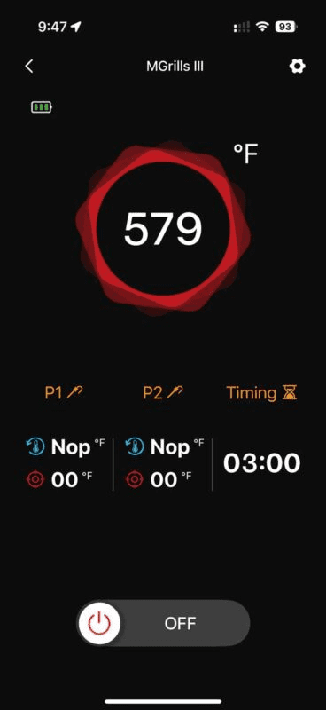 Monument Grills has a handy Bluetooth app that works with this and the 605 (so far) to let you monitor the grill remotely. With it, you can see the main body grill temperature, the target (and actual) probe temperatures, and you can set and monitor a timer. ​