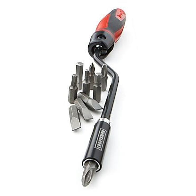 Craftsman offset the handle and included a smooth rolling bearing to give this hand held bit driver the ability to continuously drive without requiring the user to reposition their hand. When the basic design leaves a need for more torque, the innovative 90 degree breakover joint in the handle allows the user to apply a more forceful action.