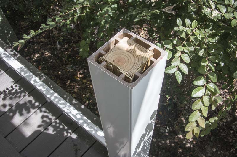 Our original bungalow style railings were very wide, so the new Deckorators CXT Pro Contemporary railing would be a slight change in styleโbut similar enough in look to work really well for our needs. In addition, our original railing spanned 10 feet or more or spaceโsomething not allowed under current building codes. During our prep phase we added supported 4ร4 posts for midpoints for our retailing, giving us the ability to use the available lengths provided by Deckorators and solve our support issues at the same time.