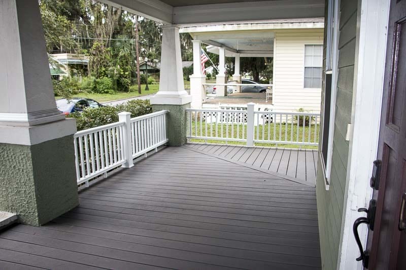 I live in an historic district in central Florida where most of the homes were built during the 1920โs or earlier. My own home was built sometime between 1919 and 1923 (the historical records lack an exact date for it). These old homes have lots of character, particularly with regard to their porches, which are covered and often constructed with old growth oak or heart pine decking. Mineย has a second generation heart pine porchย which was in need of repairโmostly due to termites and water encroachment upon the front edges where itโs pelted by each yearโsย daily summer rains. My neighbor three doors down has replaced his porchโฆthree times over the last 18 yearsโeach time with pressure-treated 5/4 lumber boards. Pressure treated decking is fine, but if itโs not treated properly and maintained carefully, it can rot, warp, and decay. A good case in point was the material on my back deck which was also read to be replaced.ย Given the time it takes to install a new deck on a large wraparound porch, I was in no mood to do this more than once. I decided to install Deckorators Vista composite decking so that I could have a once-and-done approach to recovering my front porch (and also my backย deck). Fortuitously, Deckorators also has railing kits and posts, so everything about my front porch could be made new again.