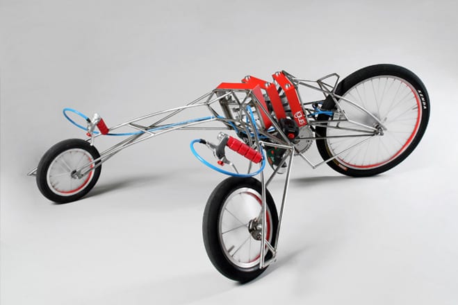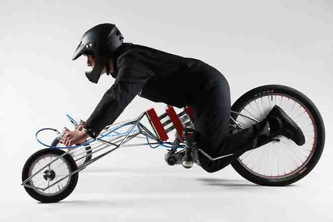 If only I had a machine shopโฆ and a couple of monthsโฆ and some access to fancy overrunning clutch gearwheels and a design shopโฆ andโฆ actually, this design might just need to go commercial, though perhaps with a bit more of a comfortable ride. With the EX tricycle, the driver is forward-facing, belly-down and drives the vehicle by actuating hand and brake triggers, the former of which control the twin 18V drill/drivers that power this beast of a machine (they used Bosch, but the system is fairly universal). With arms spread wide and torso somewhat elevated (OK, contorted) from the frame, the machine can be drivenโฆ at speeds approaching 19 mph. The entire vehicle was built from scratch and modeled on the human body โ a fact that is evident when you see the very spine-like exoskeleton that requires you to use your whole body to steer.