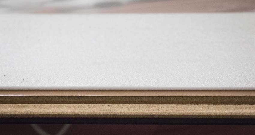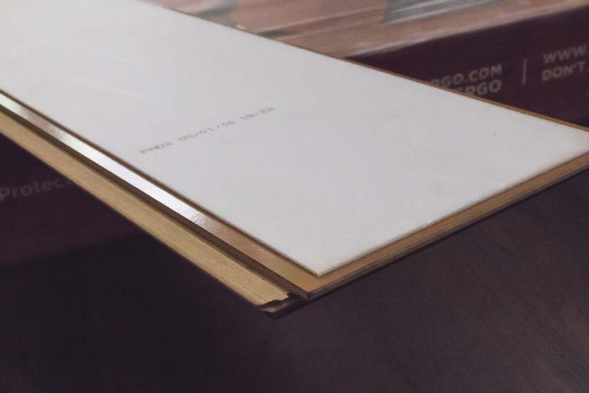 Above that exists a “balancing” layer. This layer provides stability and keeps each board from easily bowing or collapsing when you walk on it. It’s a sort of stiffener. Next comes the water-resistant HDF (high-density fiber) core board, which terminates at click joints that provide snap-together installation. The fiber board core is dense enough to resist dents from drops, so your floor looks the same 15 years later as it did the day it was installed.