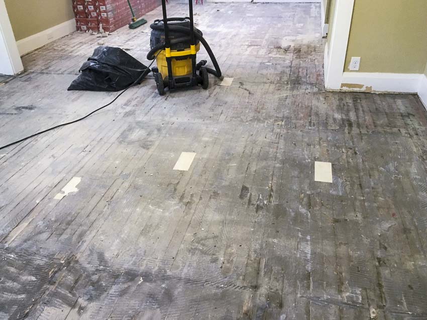 Even though this tile was laid on a heart-pine wood floor, the Makita floor scraper made quick work of it without gouging the wood. It’s a great system that not only popped off all that tile, but it also let us go back and remove 97% or more of the thinset that was left behind. When we finished, the floor had a smooth surface, all ready for prep.
