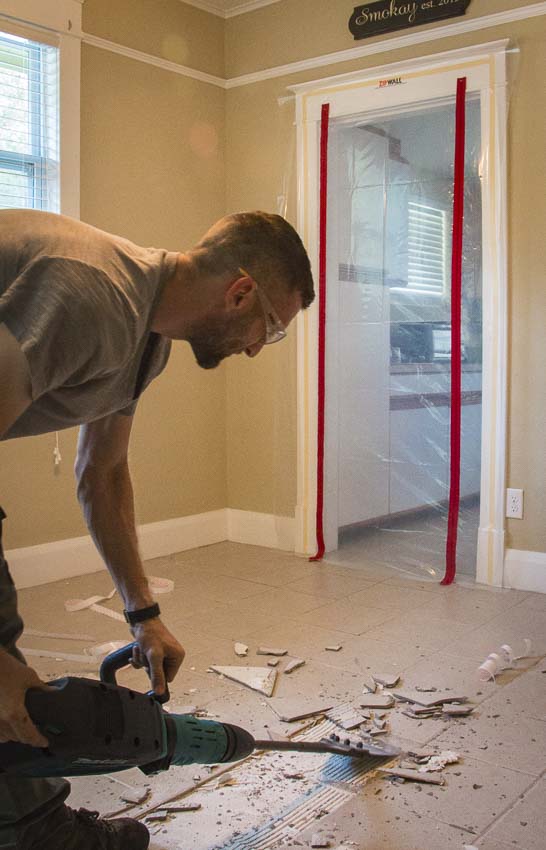 First off, this is a floating floor system designed for placement over a flat surface—either wood or concrete. We had a house full of tile—and that meant some serious demo. To facilitate this, we enlisted a few friends AND a Makita rotary hammer with floor scraper attachment. There’s simply no way to remove tile without some serious dust and debris. To keep the dust out of the adjoining rooms, we opted to use the ZipWall ZipDoor kit. We reviewed this system back in 2013, and it remains one of the simplest solutions for controlling dust from one room to another. ZipWall has since added new commercial products, and the line has expanded significantly over the last few years.
