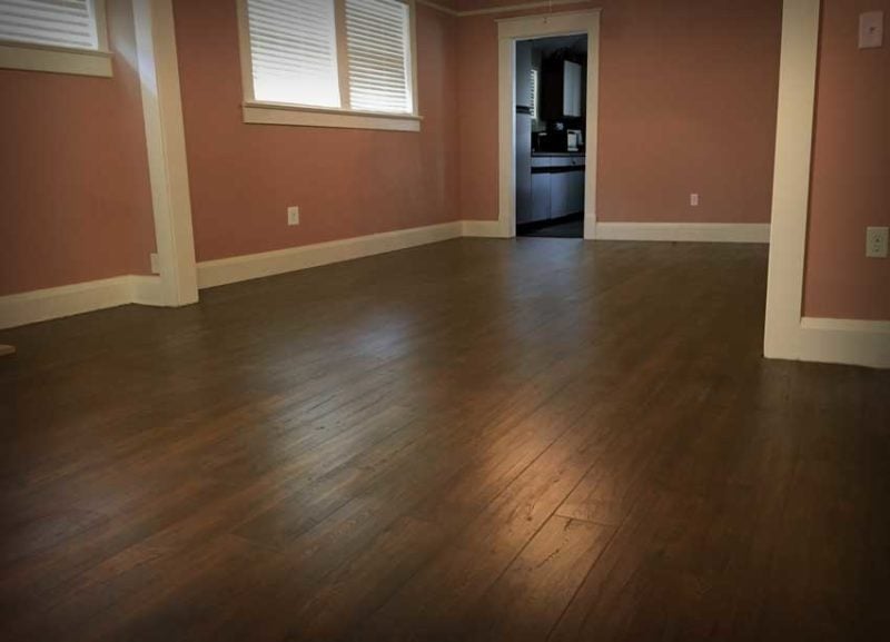 We went with Pergo Outlast Auburn Scraped Oak flooring. The color comes across as a nice dark brown with a slight reddish tint. Each board varies in detail, and lots of nice knots and cracks break up both the color and texture. Once down, you don’t really see a repetition in the pattern. You’ll want to go to your nearest Home Depot to see each of the colors up close before making a decision. My local store even had free samples available, and Pergo offers samples for $5 (out the door) on their website.