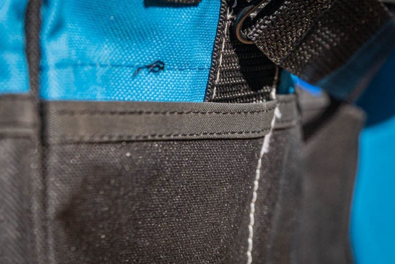The bag is held together with a combination of single and double stitching. Around the top, thereโs a metal insert sewn in that offers some rigidity and helps the top stay wide open. The bottom has a base thatโs somewhat flexible while stiff enough to add rigidity there as well.