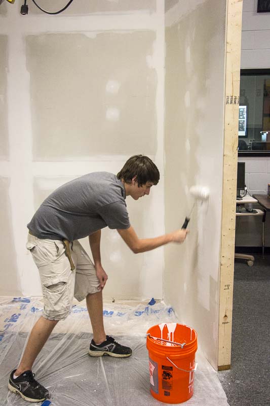 We chose a Behr Premium Plus Ultra semi-gloss sheen that offered a nice, sleek look, ideal for resisting mildew, moisture, and wear. Itโs perfect for this set since it will be in a room that will see a lot of use by multiple classes of high school studentsโthatโs a lot of hands-on walls over the weeks and months. A gallon of Behr Premium Plus Ultra can cover from 250-400 sq. ft. Since we were painting unprimed drywall, we figured on the low side and ordered a few gallons. As it turned out, that was a good call.