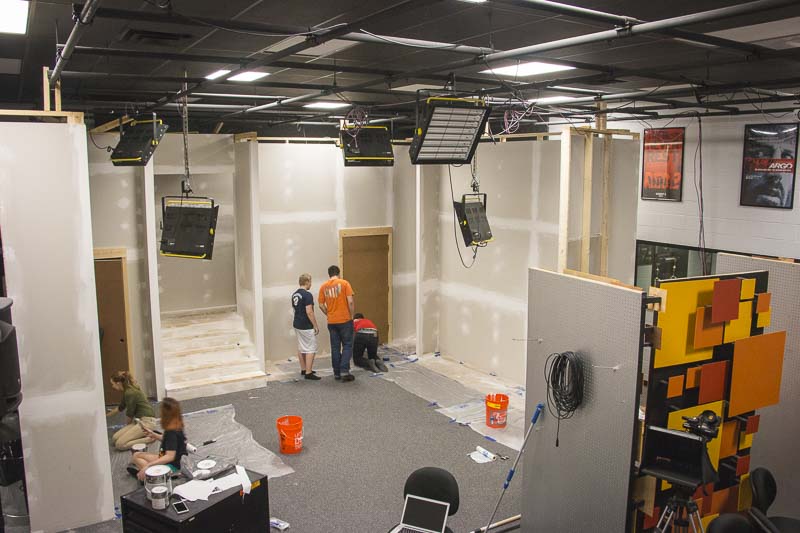 Building a set for the high school required utilizing nearly every square inch of the west side of the studio. That included reaching high up into the ceiling with 12-foot tall studs and installing a couple of doorsโand even a small staircaseโto allow for entry and exit to the set. All told, we had around 500-600 square feet of wall to paint.