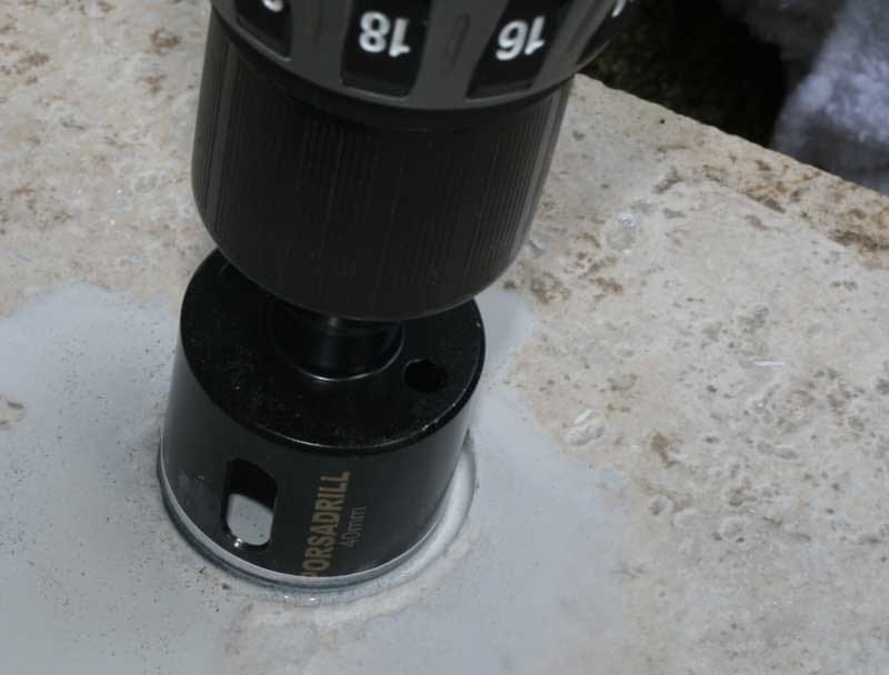 We quickly found that drilling with water sped up the process significantly, perhaps because it was easier for the blade to remove the dusty tile material as it sped through the cut, or because the reduction of heat on the blade allowed it to do a better job of cutting. In either case, it took about 8 minutes for us to get through the tough tile. Our first cut was a tad clumsy and, as you will see from the photos, we got much better as we acclimated to the proper use of the tool.