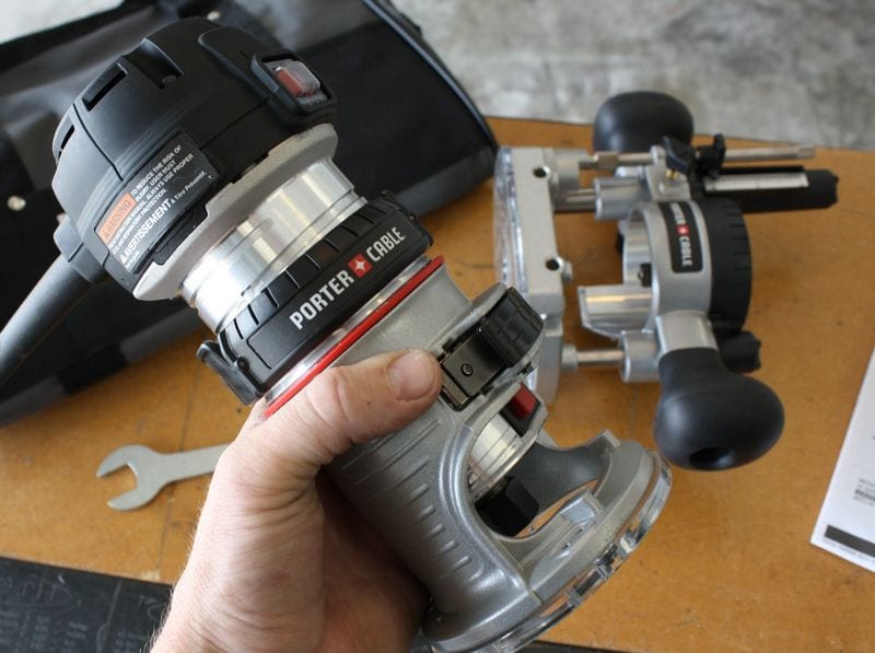 Our Porter-Cable 450PK router kit arrived in a cardboard box with everything individually packaged inside. The kit includes the compact router motor body with a fixed base, plunge base, collet wrench, owner’s manual, and a soft-sided nylon storage bag. We were a little bummed out when we found that this kit did not come with a hard shell case. To us, routers are somewhat of a precision type of tool that needs a place to keep them protected and organized when not in use. The top portion of the router’s body is made of black ABS plastic.