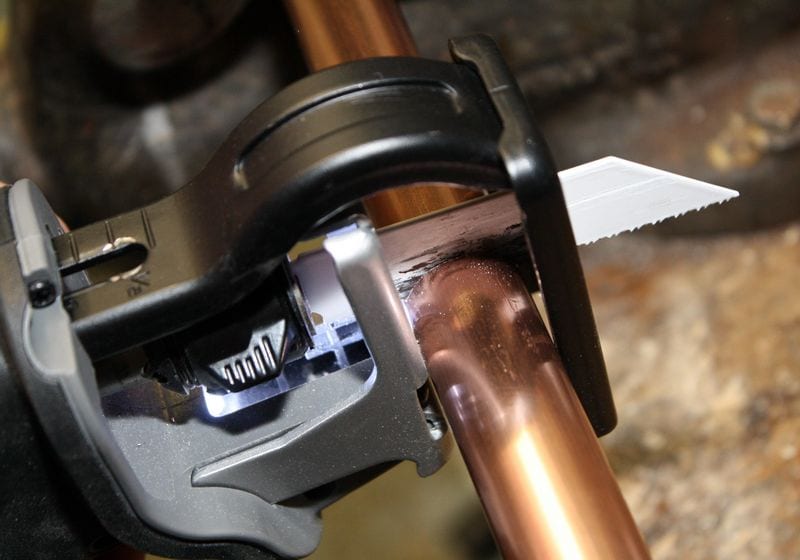 To try out the cutting abilities of the Porter Cable PCL120CRC-2 12V Lithium Cordless Pivoting Reciprocating Saw we used it in several different applications. In one of the tests, we used the included 4″ wood blade to cut through a piece of 2×4 lumber. We chose a 2×4 because it takes more energy and power to clear the blade of chips that are being cut as compared to cutting a piece of 1x that most saws (including this saw) can cut very easily. We secured a board in a vice and then started cutting and we noticed that the included wood blade was having a hard time cutting without the blade getting clogged up. We swapped out the wood blade with a 6” DeWalt bi-metal wood blade. With this blade, the saw was able to make several cuts through the 2×4 without any trouble.