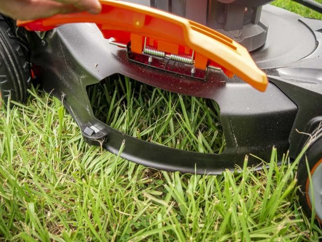 The self-propelled Redback 120V lawn mower uses a single point height adjustment. It ramps up the convenience factor since you donโt have to go around to each separate wheel and set the height four different times.