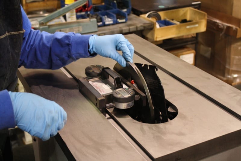 Accuracy begins on the assembly line, and thatโs where I was very impressed by the attention to detail that was given in calibrating the blade alignment. During final assembly, I watched with amazement as the worker tested and re-tested the orientation of the blade to the saw assembly. The worker was using feeler gauges as small as 0.001 inches.