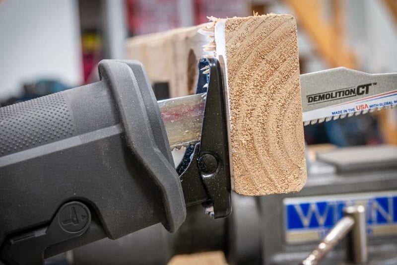 Wood is a completely different story. The sawโs time was solid in the double stud (10.69 seconds) and it torched our roofing sandwich in just 17.40 seconds. To put that in perspective, Milwaukeeโs M18 Fuel Super Sawzall took just over 20 seconds to rip through the roofing sandwich. Thatโs impressive!
