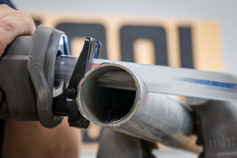 That wasnโt what we were expecting, so we took a closer look at each section. Starting in the cast iron, Ridgidโs aggressive stroke length and speed may have actually hurt its time a bit. It had some trouble getting the bladeโs carbide teeth going and took some time to get them cutting efficiently. In fact, feathering the trigger for a soft start helps a lot and can make up quite a bit of time.