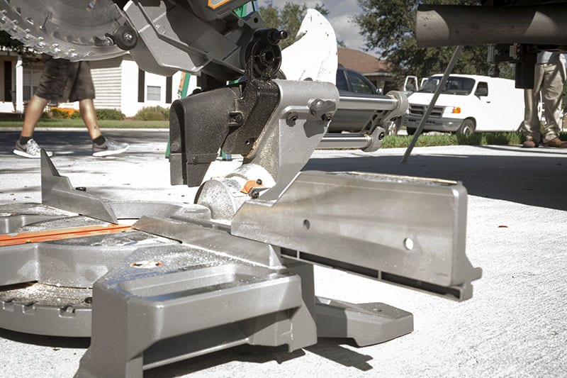The safety trigger is excellent. You have to push a switch with your finger and then pull the trigger for the blade to turn. The slide works smoothly, and I found the arm lock easy and convenient to use. The detents work well to lock in the miter. The paddle for rotatingย the Ridgid R48607B sawโ€™s miter table is a far superior design to a threadedย screw style.