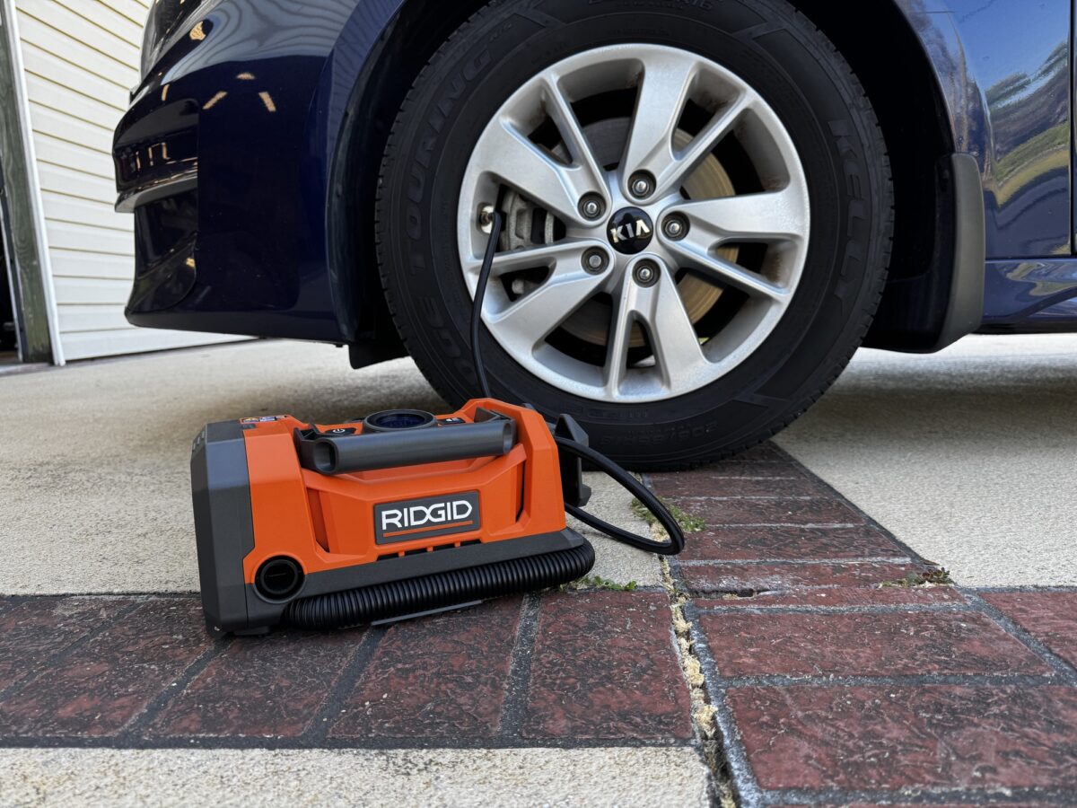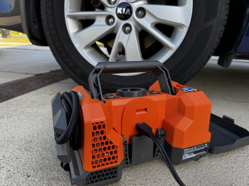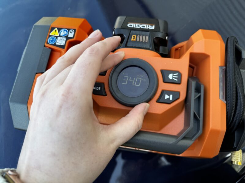 I like that Ridgid kept a similar design for the rotating digital dial that we saw in the last model. It’s an intuitive and simple way to set your target PSI. When you’re done inflating, an auto-shutoff mode ensures you don’t over-inflate past your desired PSI level.