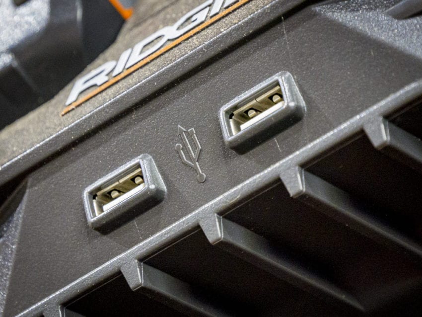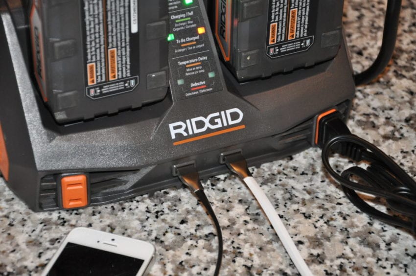 Now, I know what youโre thinking: Ridgid isnโt the only charger that allows you to charge a mobile device. Iโll agree with you on that point, but I will add this: the Ridgid dual-port charger also features two AC ports in addition to the USB connectivity. It might be one of the only ones that I have come across that has this feature. This means that, if you have multiple chargers, you can daisy-chain them all together without monopolizing all of your available power outlets.