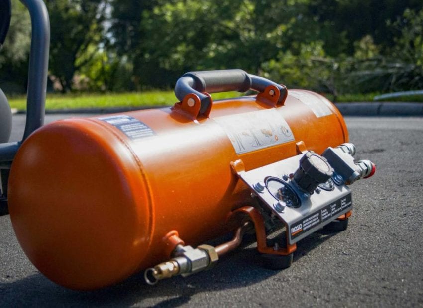 Itโs easyย to detach the orange tank for portable work. You can use the orange tank as a standalone air sourceย or daisy chain it to the grayย tank with a hose. The first option allows complete portability without aย refill while the second allows a hose-length radius of work with automatic refilling. Using a hose to extend your reachย is particularly helpful if you have the entire machine in the back of your truck. You can reapย the benefits of Ridgidโs Subaru-powered 8-gallon compressor for the size and weight of a 4-gallon tank โ not to mention the noise reduction for interior work.