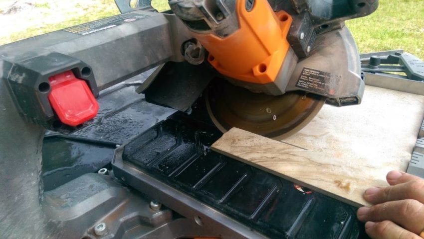 And the final test was cutting 24 x 24, 3/8” thick tile.  Our absurdity with oversized items has long-since spilled into our flooring, so we test the limits of the 8” RIDGID.  This is where the saw was stretched a bit in its capabilities; albeit, it accomplished the tasks.  Cutting such a large tile was not an issue with the performance of the 12-Amp motor or the 8” blade, just more so an issue for the table and frame-clearance.  When cutting just a couple inches off a full tile, the cut had to be made by hanging the large majority of the tile off the right side of the table…trying to cut with the large area on the left, the tile would hit the frame of the saw when the table rolled forward.  Any diagonal cuts with this size tile will pretty much be a pain, but it’s an 8” saw, right?!