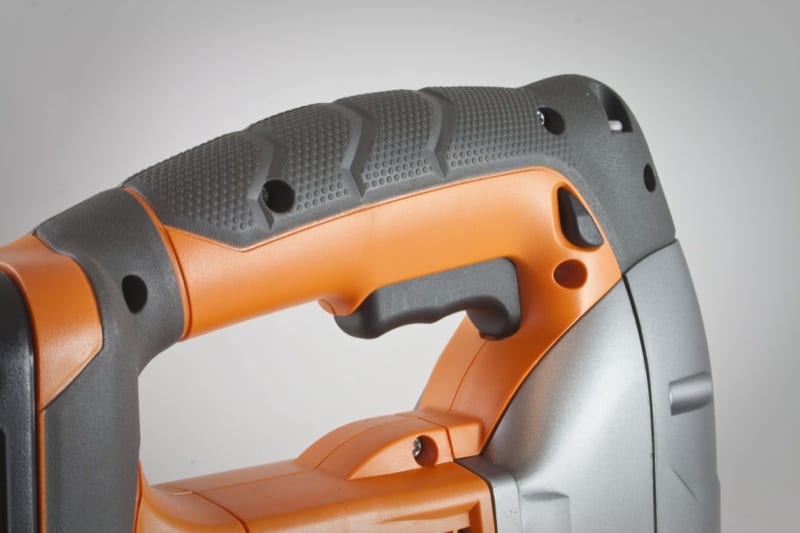 On the side of the tool is a four-position orbital lever that lets you turn off the orbital action or crank it up to its maximum setting for when you want to make fast but accurate cuts. The grip on the tool is nice, and it affords excellent control during use with no slippage. My hands also didnโt get uncomfortable, even when giving the tool an extended run. Iโm used to the overhead style of jig saw and so the shape of the R8831Bโs handle seemed right in line with what I use almost every week.