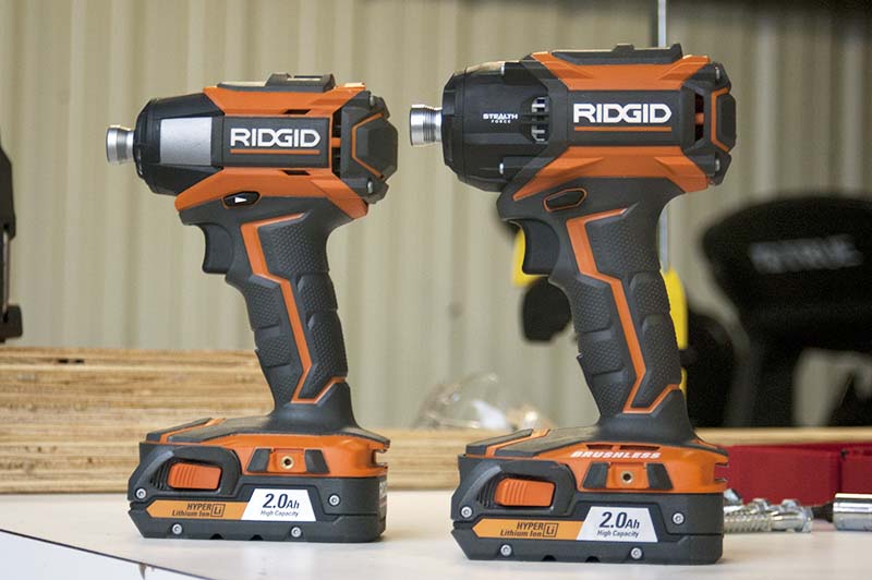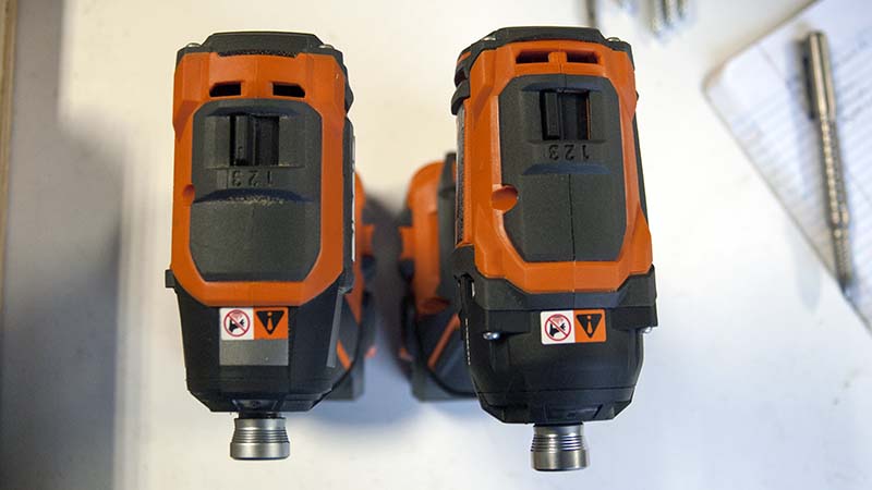 The Ridgid Stealth Force (right) has a bigger footprint than the impact driver.