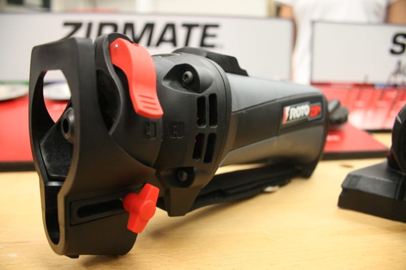 The tool uses the RZ Connect System, and the kit includes a ZipMate cut-off connect head that is compatible with all RotoZip connect attachments and accessories. The handle of the tool is lined with soft rubberized grip housing, so itโs very comfortable to use. Retailing at $129, RotoZip is nearly doubling the price of some other systems on the market; however, they are also upping the power and offering a potential accessory smorgasbord so as to make this single tool much more versatile in daily use. And thatโs what Coe communicated as a chief design goal during the event.