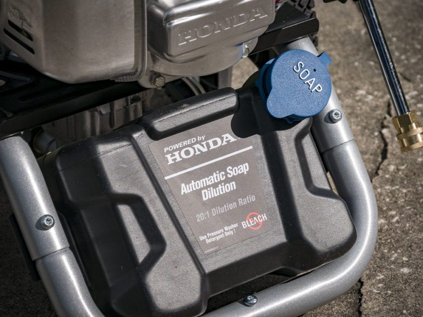 The detergent tank automatically mixes at a 20:1 ratio with water in a downstream fashion. According to the manual, you can convert it to an upstream mix, but youโll need to contact customer service for more information on that.