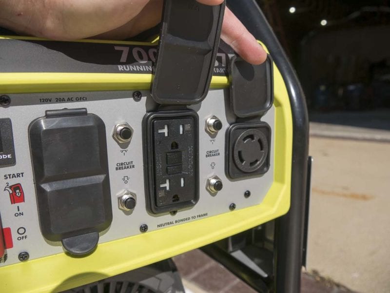 Connections are pretty simple โ you get four 120V AC outlets and one 120V/240V 30A outlet to work with. Rubber covers help prevent moisture intrusion when theyโre not in use. Youโll want to check the weather forecast if youโre going to be running the generator outside of cover since Ryobi specifically tells you not to run in the rain or snow.