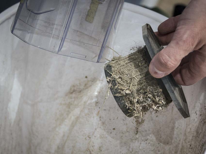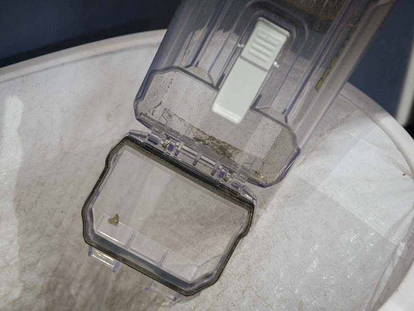 We have about 650 square feet of office space here at Pro Tool Reviews, and it has both tile floors and an area rug. That area rug gets dirtyโฆquite often. The difficulty is that weโre constantly entering and exiting the office from both the front door and the shopโฆand we test a lot of tools. The power head did a decent job picking up the ground-in grass, sawdust, and dirt that covered the rug. The head measures around 8.5 inches wide where it pulls dirt into the rollers, so you get a decent coverage swathโbut still small compared to most corded vacuums.