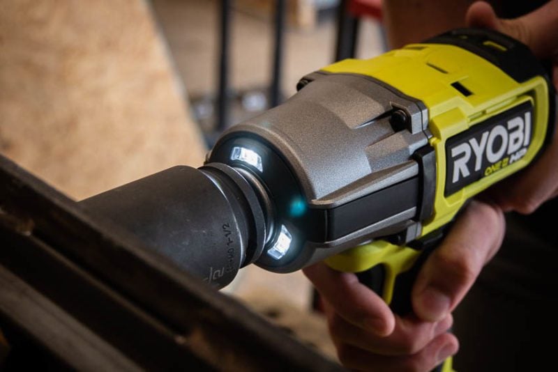 Ryobi brought back their triple-LED light system for this impact wrench. Three LEDs surround the drive and do a much better job of lighting up your work area than foot-mounted lights.