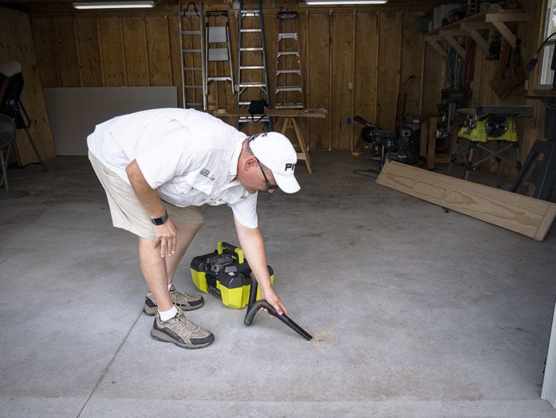 PTR co-founder Tom Gaige just finished helping my friend, Jeff Hogan, wrap up a new workshop next to his house. As one of the more knowledgeable DIYers in my local area, I put the new Ryobi Cordless 3-Gallon Project Vacuum in his hands to see what he thinks and how he implements it into his system as a supplement to a larger shop vacuum.