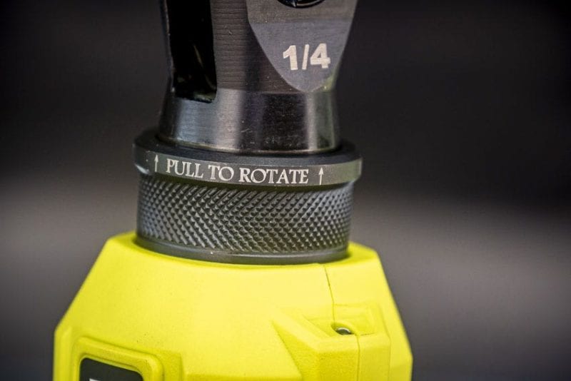 Thankfully, the Ryobi cordless ratchet has a 4-position rotating head that mitigates the awkwardness somewhat. By pulling up on the collet, you can reposition the ratcheting head to a position that works better in these tight spots.