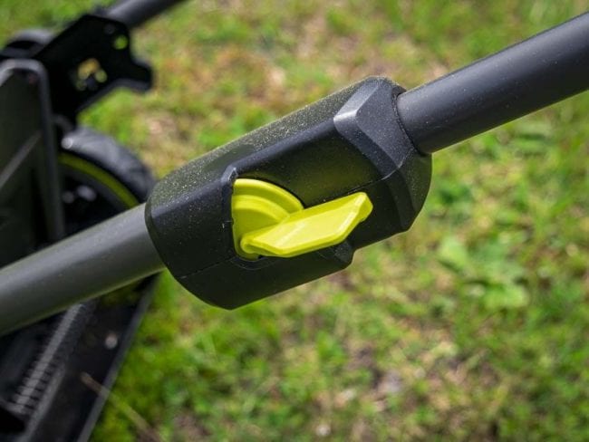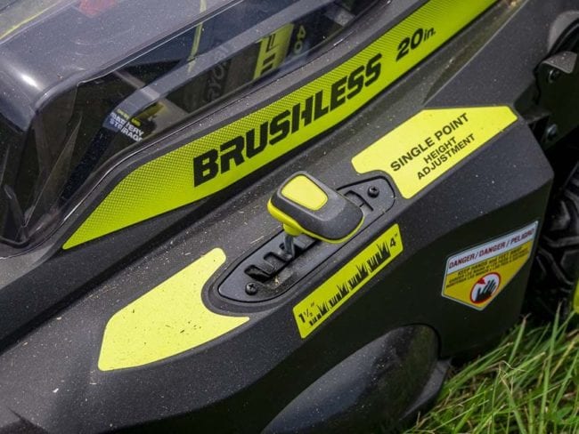 We really like the height adjustment design on this Ryobi Smart Trek lawn mower. Itโ€™s a single-point adjustment, but where other single-point adjustments can still require you to lift up while you adjust, this one really can be set one-handed without having to wrestle with it.