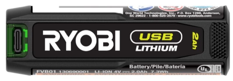 Ryobi backs up the USB Lithium 2Ah Rechargeable Battery with a 2-year warranty. It retails for $19.97.