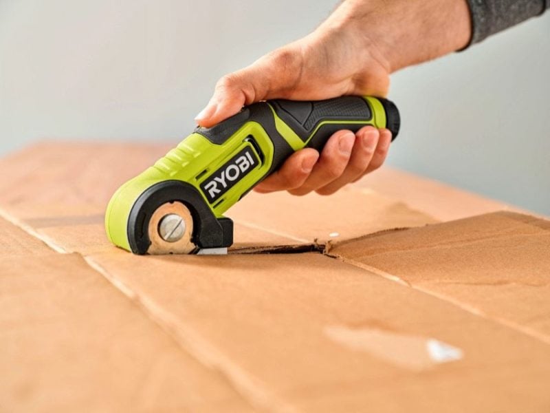 The Ryobi USB Lithium Power Cutter powers through materials like cardboard, plastic, carpet, rubber, and leather to provide quick cuts.