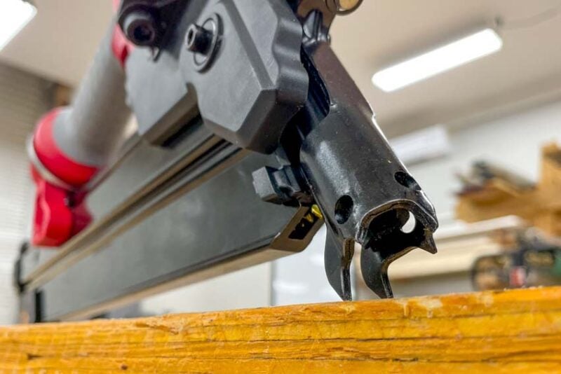 Toenailing into boards at hard angles can get tricky no matter what, and some nailers handle it better than others. This nailer underwent a bit of a facelift towards the business end to help improve performance in this area. The nose is now more aggressive with larger steel barbs that get a much better bite into the wood compared to other framers weโve used in the past.