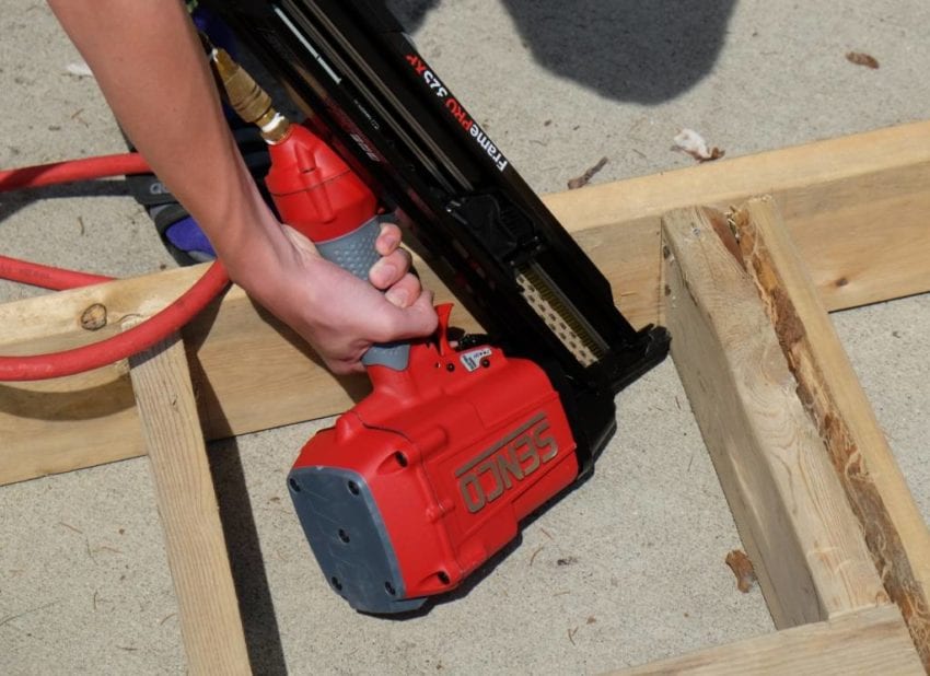 Pros know that using a framing nailer all day requires a well balanced and ergonomically sound tool. When youโ€™re working around on ground level builds like these, a lack of attention to the ergonomics willย leave you with sore muscles and joints by lunchtime. The constant reaching up and around vertical builds will do the same. Fortunately, the Senco FramePro 325FRHXP offeredย greatย balance andย I really liked theย comfortable textured grip.