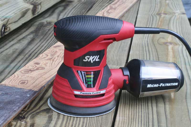 Among other things, we used the Skil Random Orbital Sander to take a layer off of old heart pine flooring material that we were using as replacement boards in a 1920s home. The sander did an adequate job. It wasn’t as fast as a belt sander, but we didn’t expect it to be, either. Tilting the Orbit sander allowed us to do detail work and remove hard-to-reach spots and generate a nice, smooth surface free of defects. We started the project with 60 grit discs and then moved on to 120 grit to provide a smoother finish.