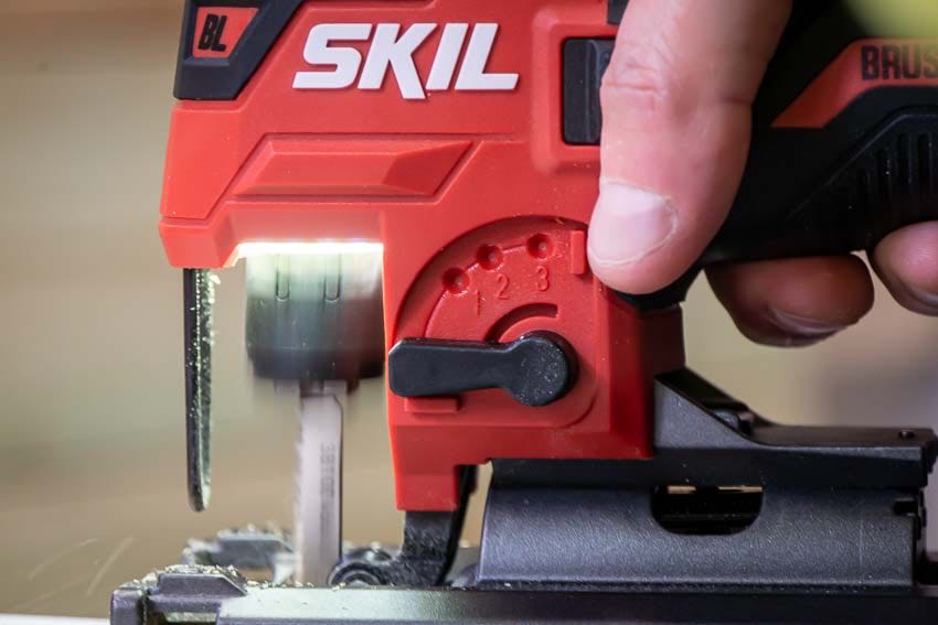 Like most barrel grip jigsaws, Skil uses an on/off switch paired with a variable speed trigger. Thatโs my personal preference over a variable speed trigger.