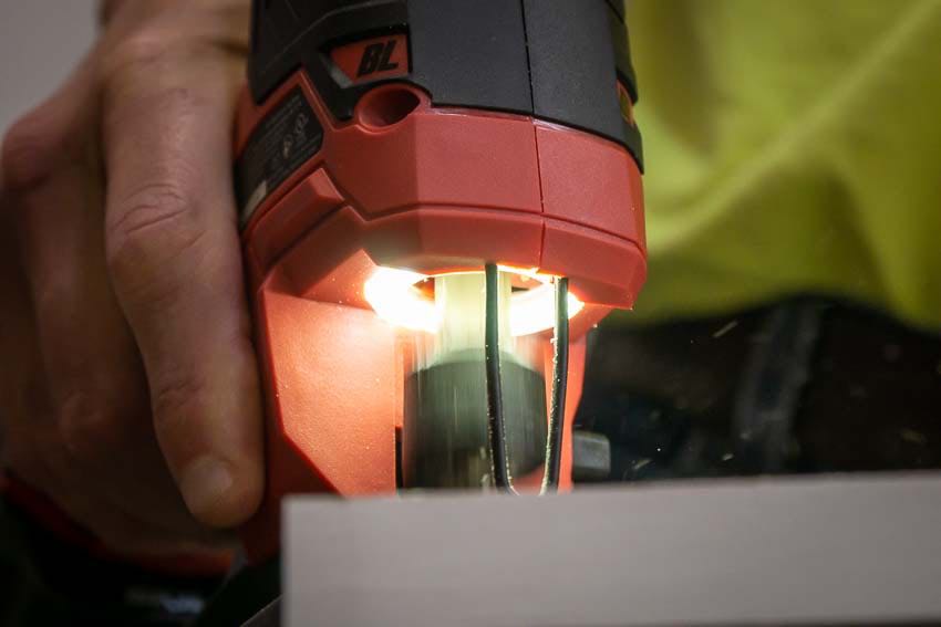 As I made my first test cuts, I was pleased with the sightline to the blade. The LED halo weโve enjoyed on other Skil cordless tools makes its way to the jigsaw. Combined with the blower, they do a great job keeping your cutline visible when youโre cutting at high speed.